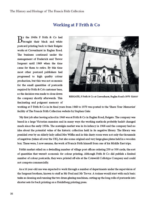 Francis Frith founded his photographic views publishing company in Reigate, Surrey, in 1859, prior to his third and final photographic tour of the Middle East in the summer of that year. Through his own enterprise, Frith became wealthy at a comparatively young age and decided to combine business with pleasure. He had a desire to make a lasting and interesting record of the places he visited. Photography, combined with publication provided the solution.