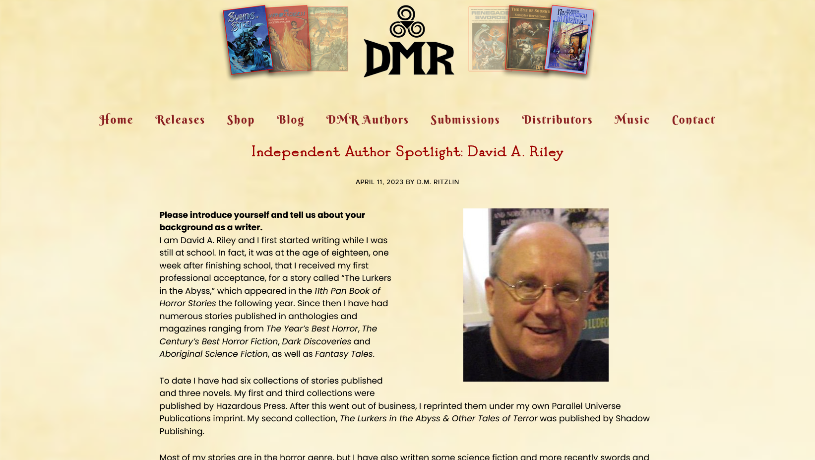 David A. Riley writes horror, fantasy and SF stories. In 1995, along with his wife, Linden, he edited and published a fantasy/SF magazine, Beyond. His first professionally published story was in the 11th Pan Book of Horror in 1970. This was reprinted in 2012 in The Century's Best Horror Fiction edited by John Pelan for Cemetery Dance. He has had numerous stories published by Doubleday, DAW, Corgi, Sphere, Roc, Playboy Paperbacks, Robinsons, etc., and in magazines such as Aboriginal Science Fiction, Dark Discoveries, Fear, Fantasy Tales. His first collection of stories (4 long stories and a novelette) was published by Hazardous Press in 2012, His Own Mad Demons. A Lovecraftian novel, The Return, was published by Blood Bound Books in the States in 2013. A second collection of his stories, all of which were professionally published prior to 2000, The Lurkers in the Abyss & Other Tales of Terror, was launched at the World Fantasy Convention in 2013. His fantasy novel, Goblin Mire, was published by Parallel Universe Publications in 2015. Their Cramped Dark World is his third collection of short stories. With his wife, Linden, he runs a small press called Parallel Universe Publications, which has so far published ten books. His stories have been translated into Italian, German, Spanish and Russian.