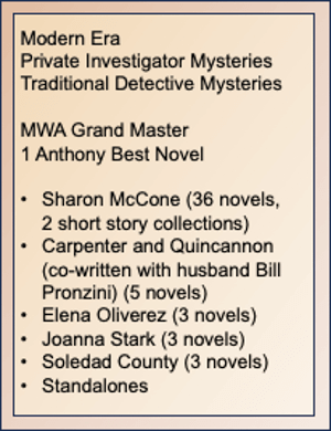Muller has written many novels featuring her Sharon McCone female private detective character. Vanishing Point won the Shamus Award for Best P.I. Novel. Muller had been nominated for the Shamus Award four times previously.