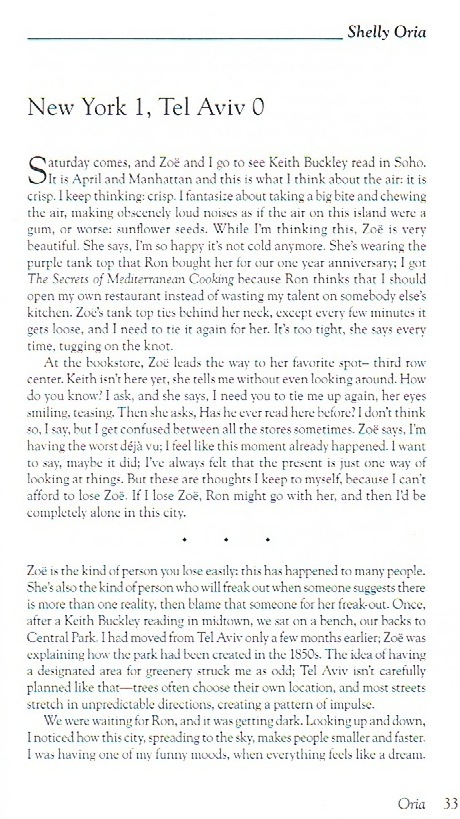 Shelly Oria was born in Los Angeles and grew up in Israel. Her short story collection, New York 1, Tel Aviv 0, came out from FSG and Random House Canada in November 2014. Shelly's fiction has appeared in The Paris Review, McSweeney's, fivechapters, and Electric Lit's Recommended Reading among other places, and won the Indiana Review Fiction Prize, a Sozopol Fiction Seminars Fellowship in Bulgaria, and the LMCC Workspace Residency among other awards. She holds an MFA from Sarah Lawrence College, curates the series Sweet! Actors Reading Writers in the East Village, has a private practice as a creativity coach, and teaches fiction at Pratt Institute, where she also co-directs the Writers' Forum.